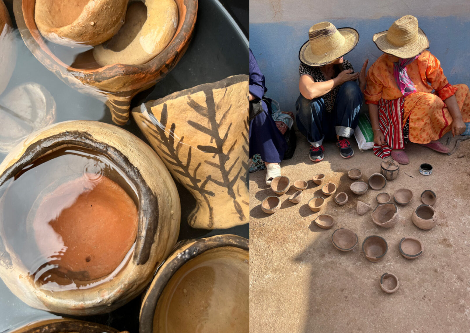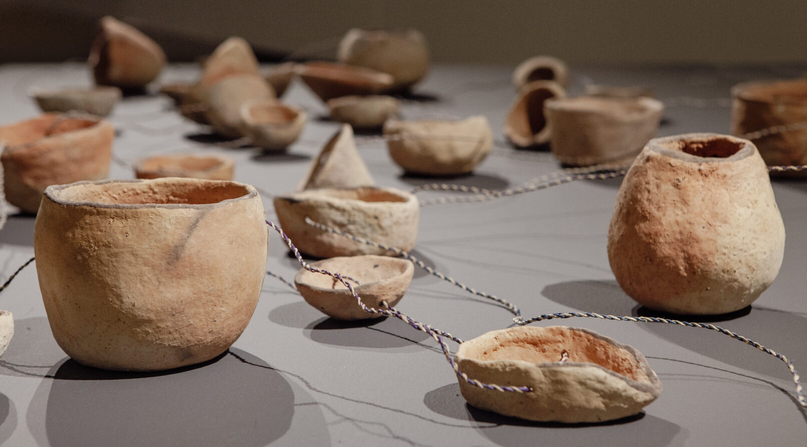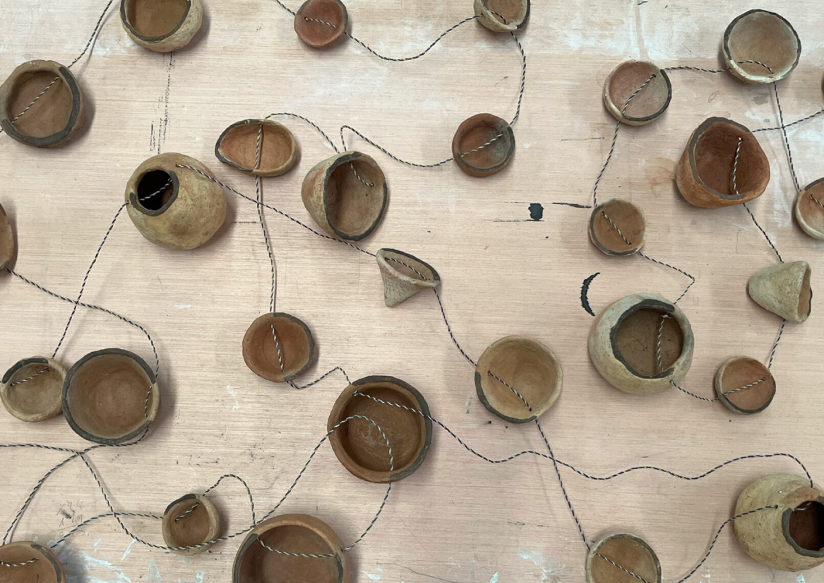 «Rfag n’timgharine (ⴰⴼⴰⴳ ⵏ’ⵜⵉⵎⵖⴰⵔⵉⵏ)» was generated in Beni Boufrah, in the Rif Mountains of Morocco, with the support of the cultural space L’apartment 22 in Rabat, thanks to the invitation of curators Natalia Valencia Arango and Abdellah Karroum. María Camila worked with traditional Amazigh ceramists during this time. For 15 days, the artist lived, ate, and communicated with the women through clay. They taught her the unique properties of this material, different from the clay she had worked with before. Although it is resilient, this clay is not very elastic, requiring numerous hours of work to mold and shape. Throughout this process, the installation Rfag n’timgharine was created, a constellation of pieces reflecting the network that exists among these women, who have supported each other throughout their lives, sharing knowledge from generation to generation.