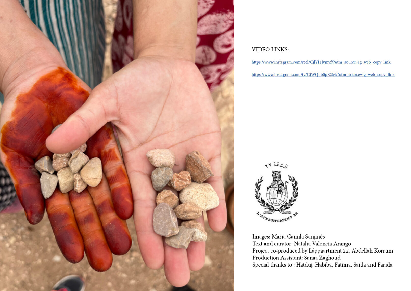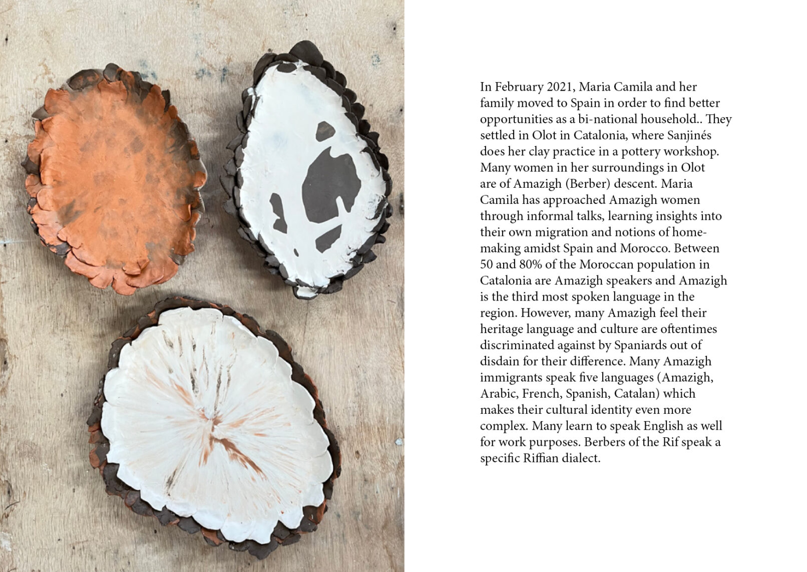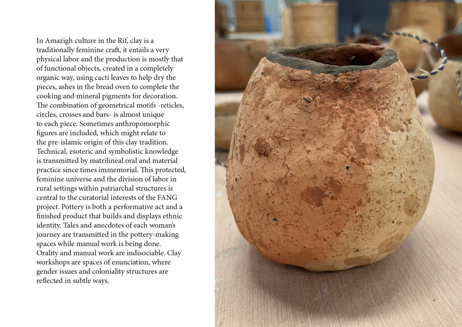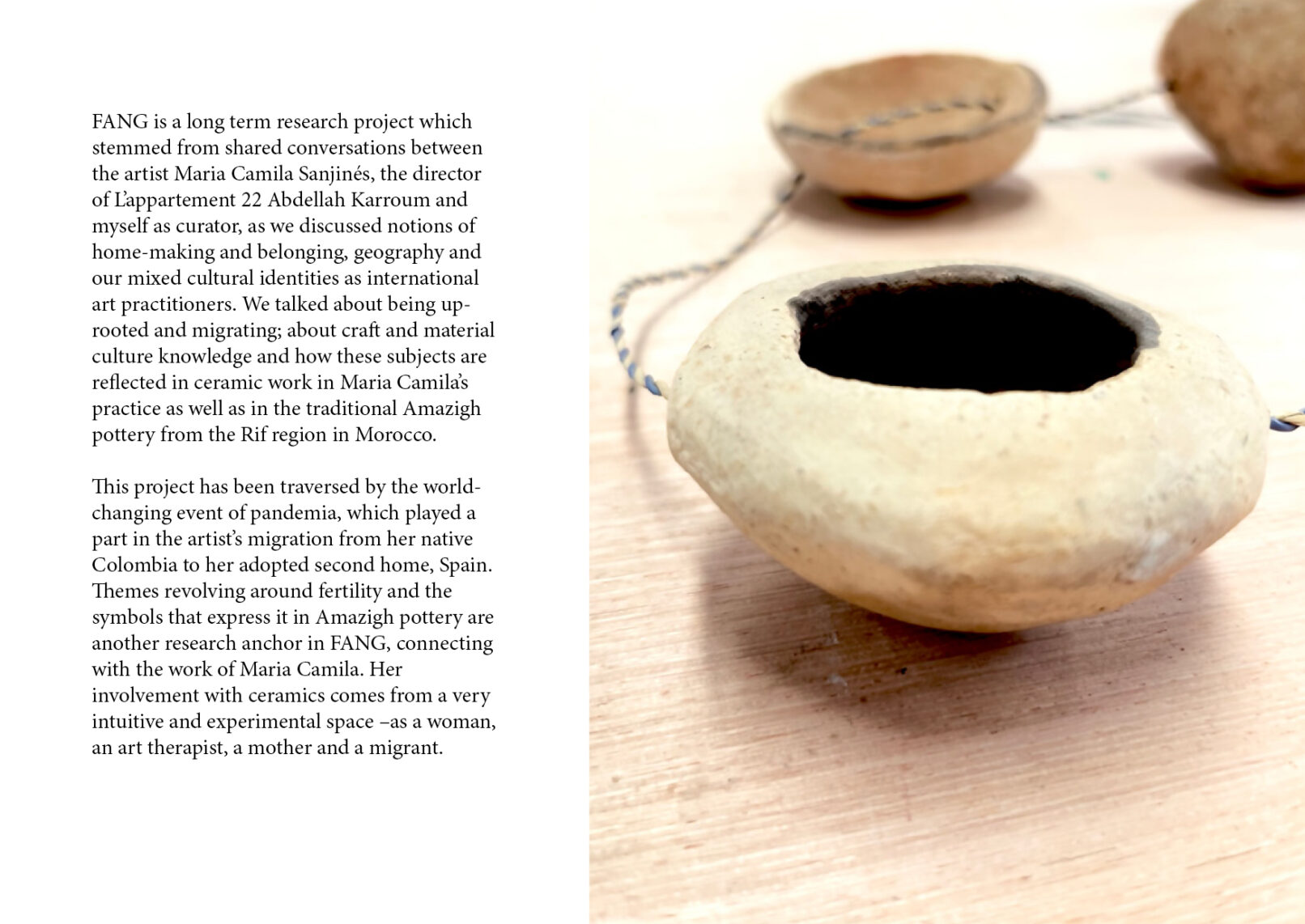 Rfag n’timgharine (ⴰⴼⴰⴳ ⵏ’ⵜⵉⵎⵖⴰⵔⵉⵏ )se generó en Beni Boufrah en las montañas del Rif de Marruecos con el apoyo del espacio cultural L’apartment 22 en Rabat gracias a la invitación de los curadores Natalia Valencia Arango y Abdellah Karroum, en dónde Maria Camila estuvo trabajando con unas ceramistas tradicionales Amazigh. Durante 15 días, la artista vivió, comió y se comunicó con las mujeres a través del barro. Fueron ellas quienes le enseñaron las propiedades particulares de este material, distinto al barro con el que había trabajado anteriormente. Aunque es resistente, este barro es poco elástico, lo que requirió numerosas horas de trabajo para moldearlo y darle forma. Durante ese proceso se generó la instalación Rfag n’timgharine una constelación de piezas que refleja la red que existe entre estas mujeres, quienes se han acompañado a lo largo de sus vidas, compartiendo conocimientos de generación en generación.