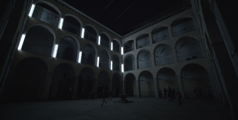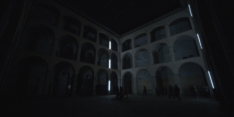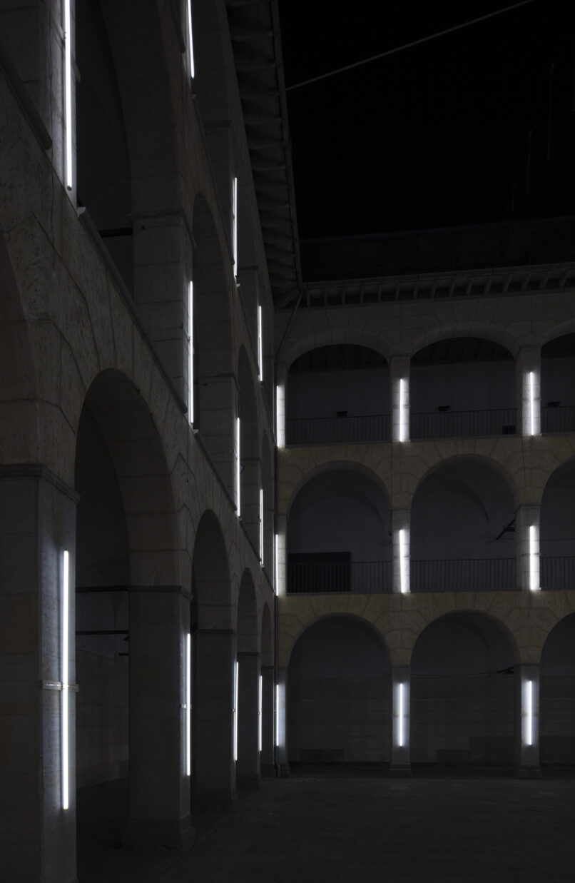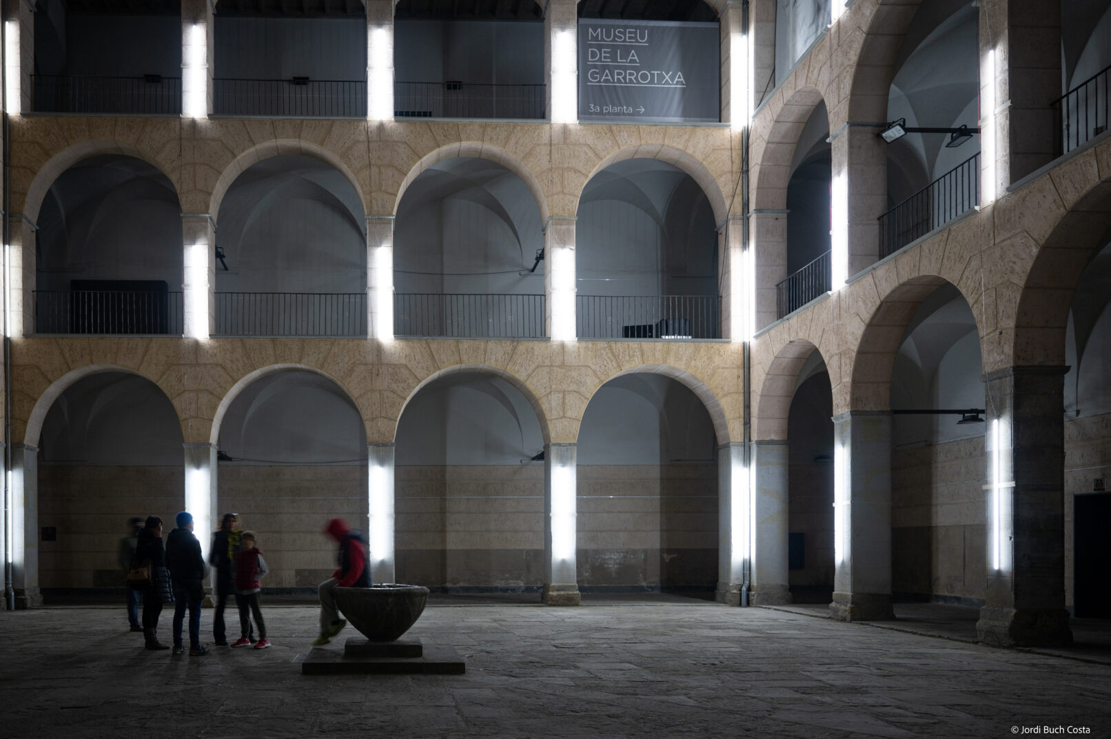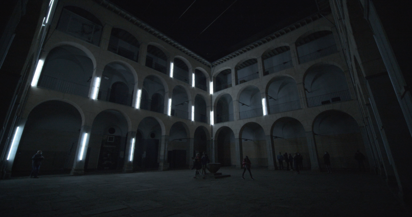 Una gran partitura audiovisual d’impulsos lumínics i pulsos sonors, converteixen el pati de l’Hospici en una caixa de ressonància per als sentits. Un espai auster de grans dimensions que, envoltat per galeries d’arcades de mig punt, conformen un claustre. La disposició simètrica i repetitiva de les seves pilastres de granit, despleguen l’univers de penombres i contrallums que conviden a l’espectador a la