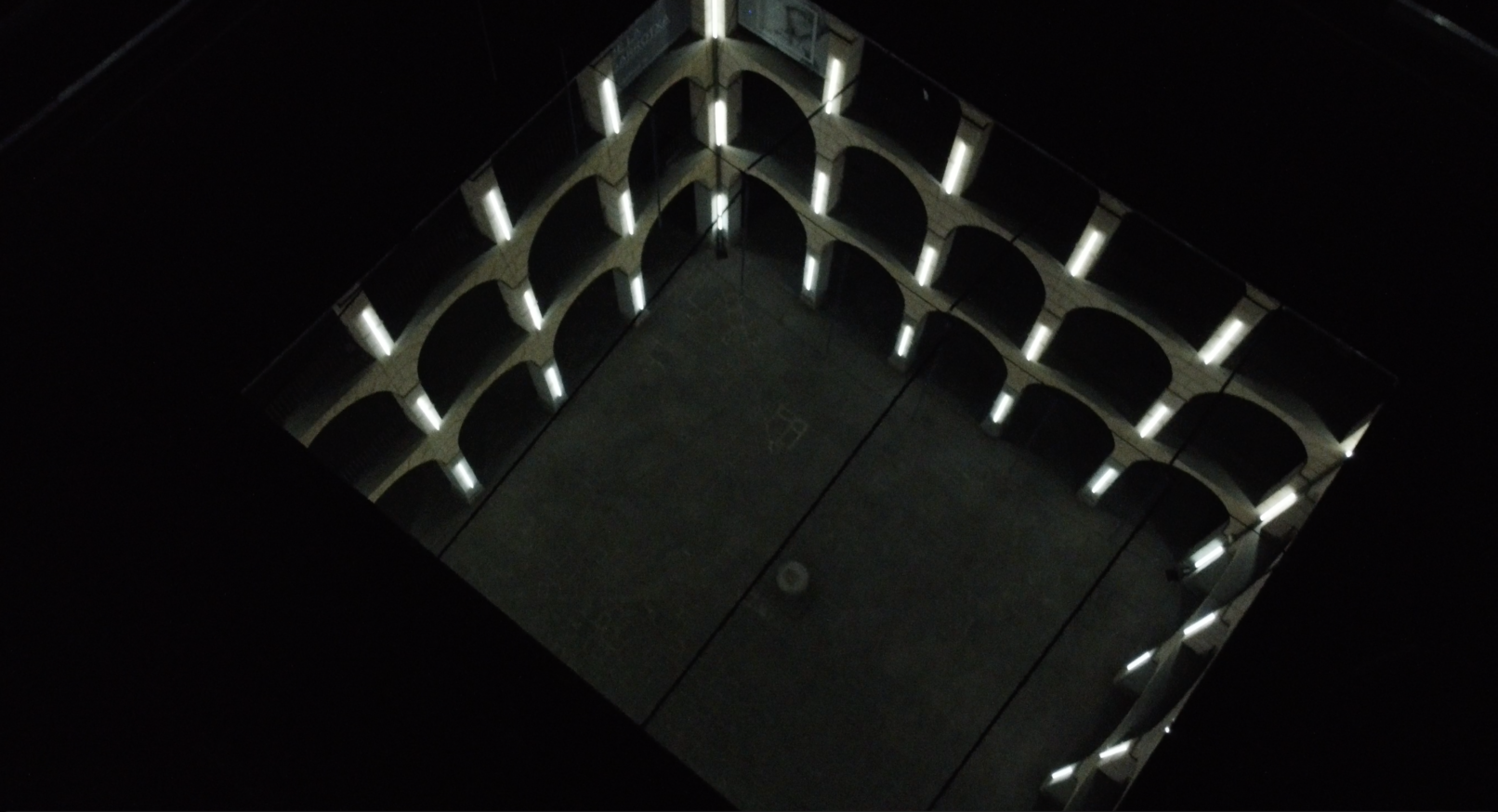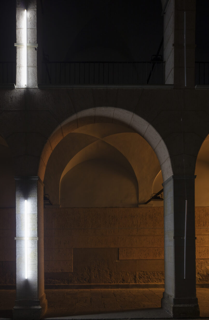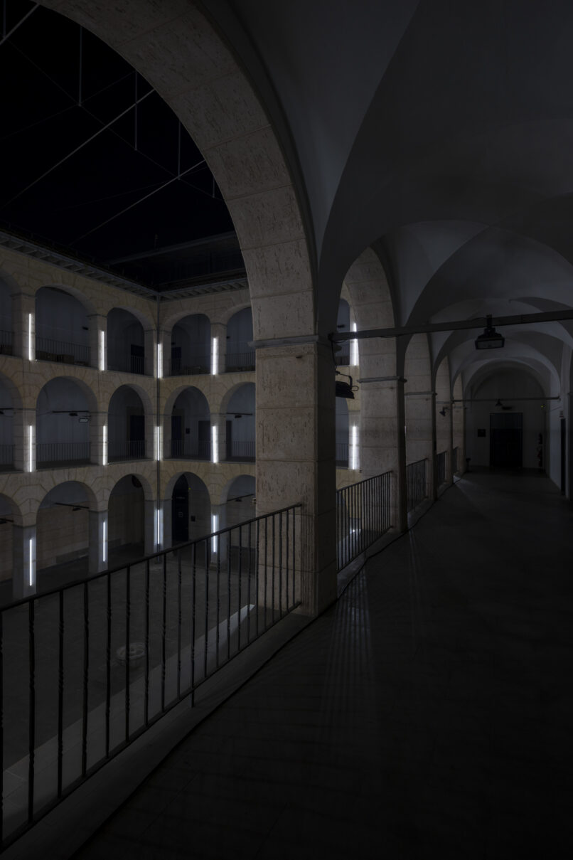 Una gran partitura audiovisual d’impulsos lumínics i pulsos sonors, converteixen el pati de l’Hospici en una caixa de ressonància per als sentits. Un espai auster de grans dimensions que, envoltat per galeries d’arcades de mig punt, conformen un claustre. La disposició simètrica i repetitiva de les seves pilastres de granit, despleguen l’univers de penombres i contrallums que conviden a l’espectador a la