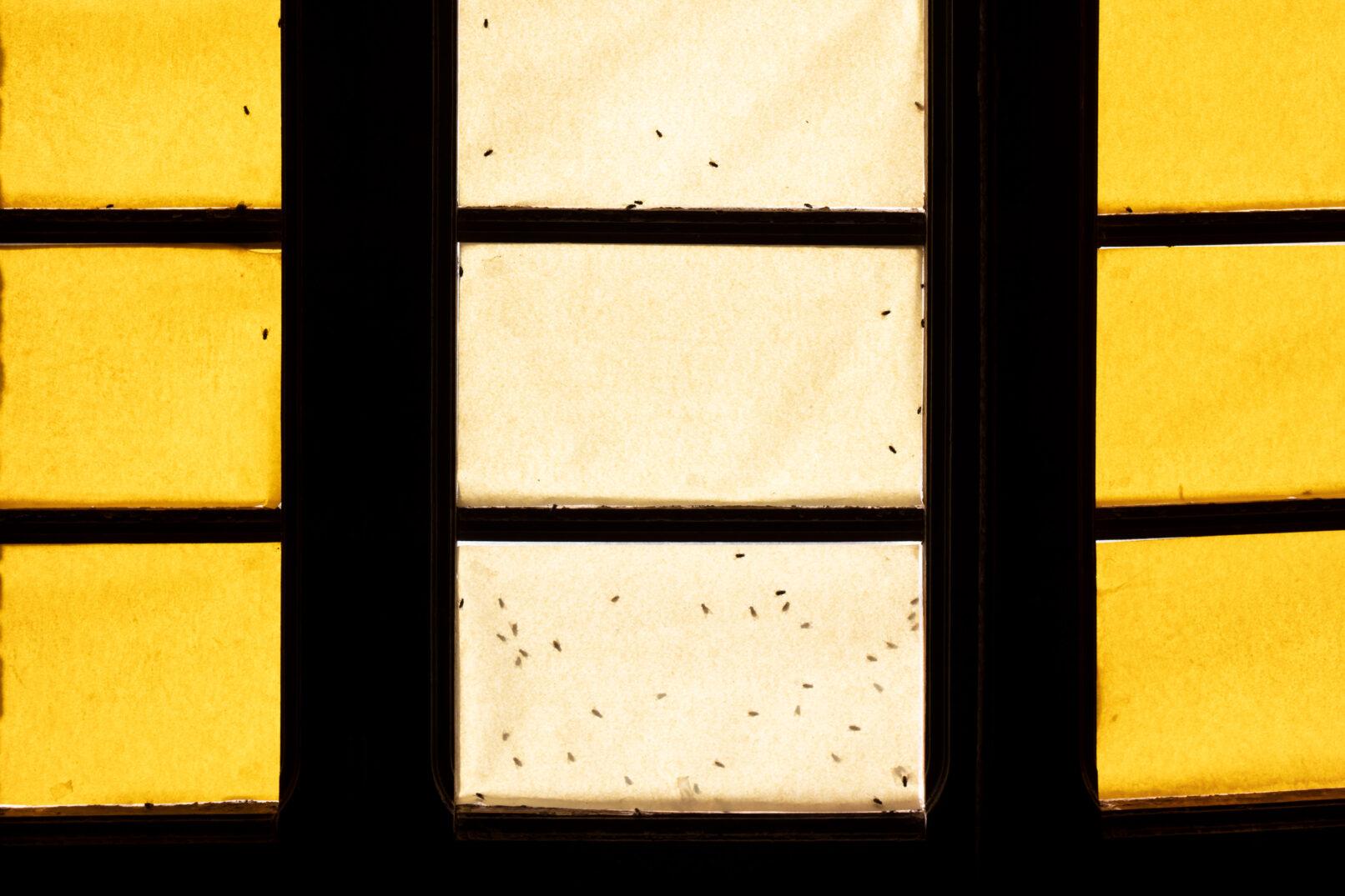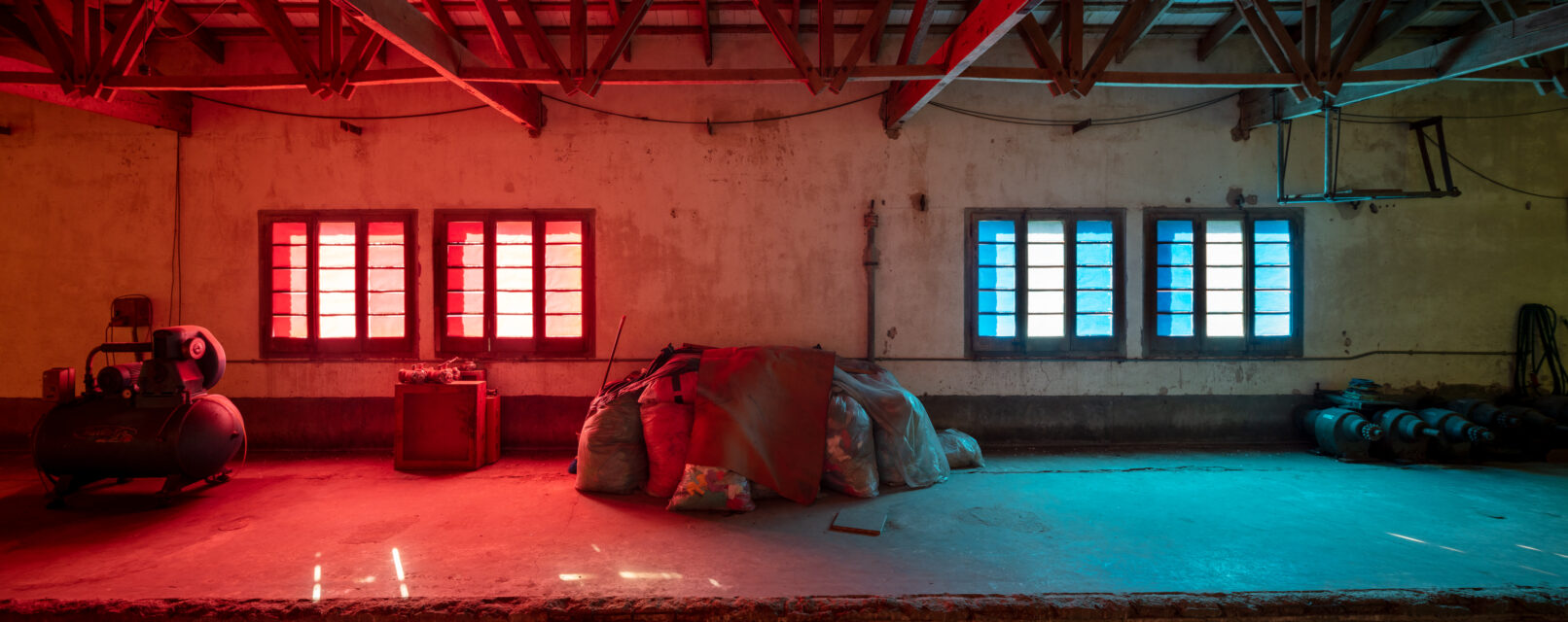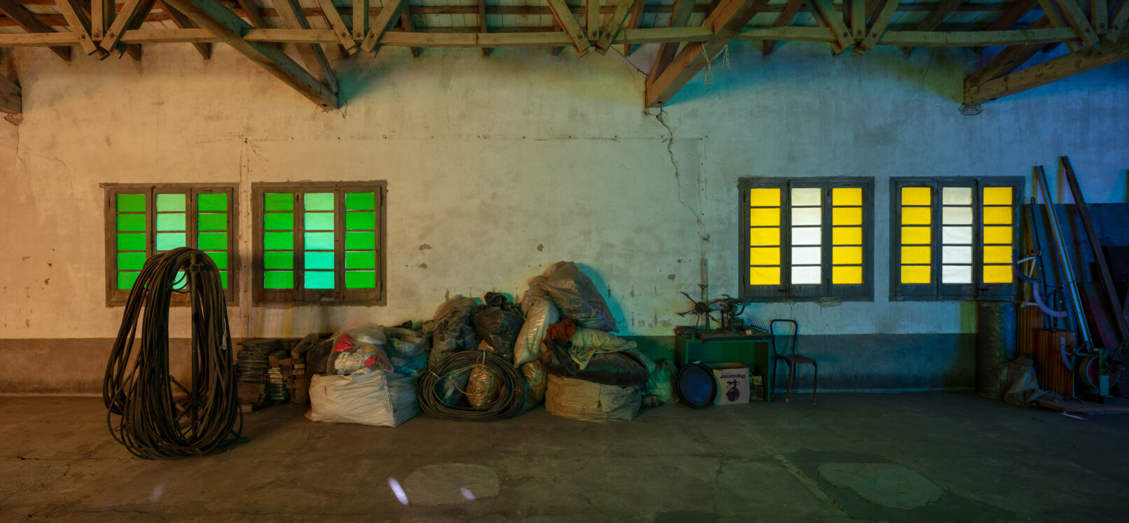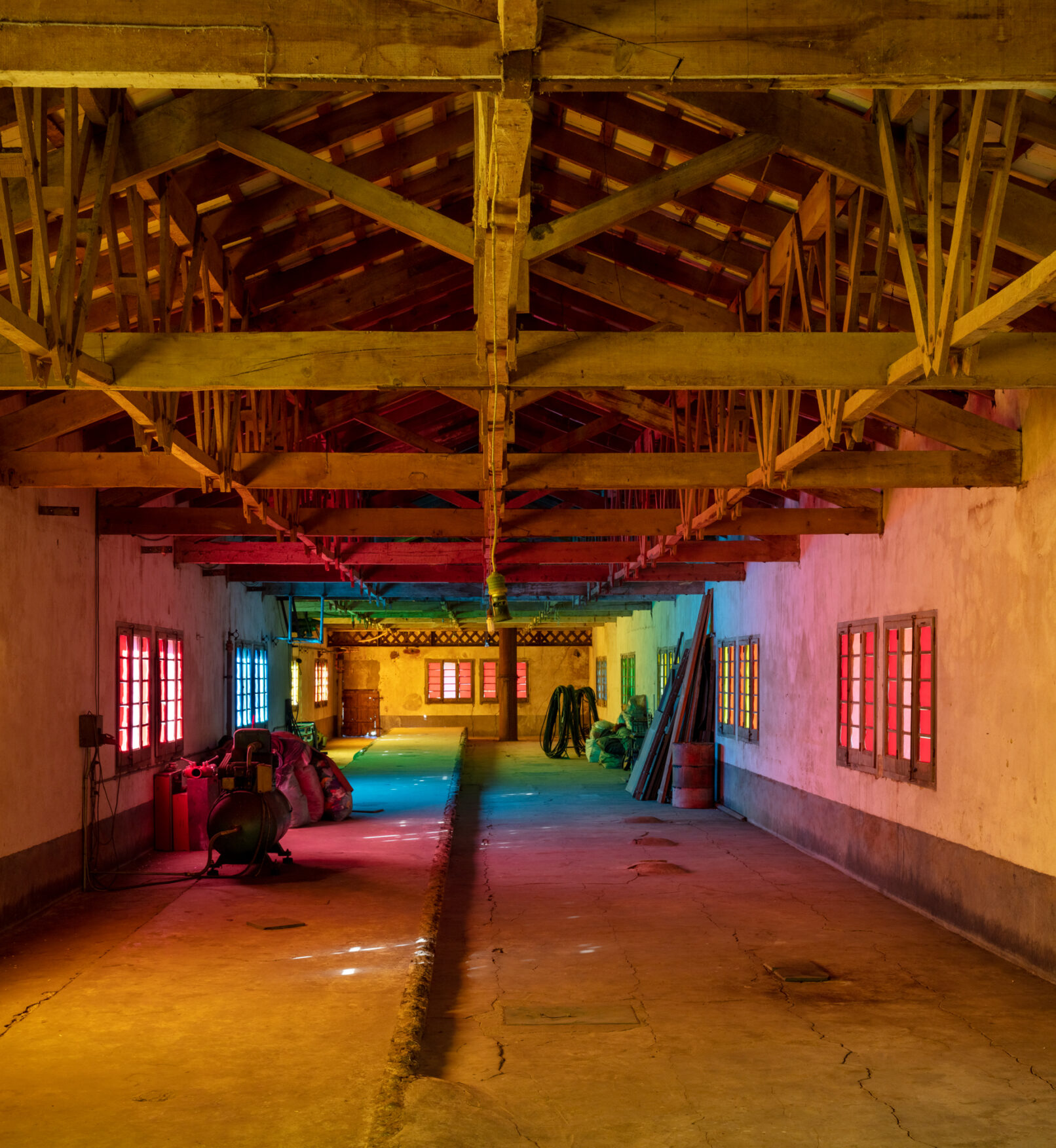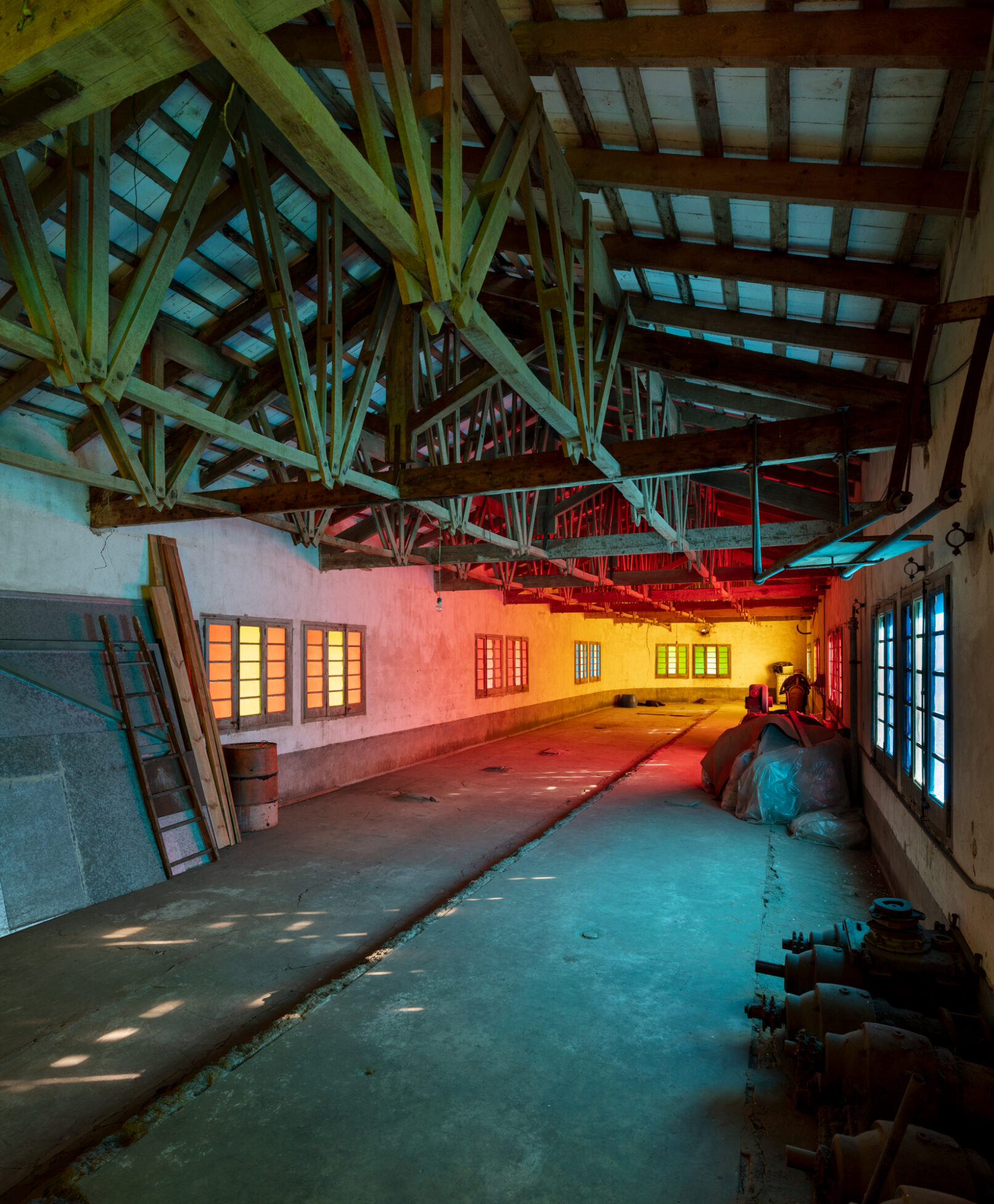 La nau superior del complex industrial de can Porxas, presidida pel poderós embigat de fusta del sostre, ofereix una sensació diàfana i lluminosa gràcies a la trentena de grans, rítmiques i simètriques finestres laterals. Les obertures, més enllà de l’efecte estètic que ens produeixen avui en dia, tenien la raó plenament utilitària d’aconseguir la màxima claror possible per facilitar el rendiment dels treballadors. En aquesta intervenció, la llum és l’eina de treball per vestir l’espai, donar-li un nou significat i recuperar traces de la memòria del lloc. Quatre-cents cinquanta fulls de paper de color, de la casa Guarro (un tipus de paper semblant al que s’havia fabricat en aquesta mateix lloc), serveixen per absorbir la llum exterior i transformar l’espai . La disposició cromàtica, ordenada per un patró racionalista i mecànic, també remet a la monotonia de la producció fabril. Les finestres –ara vitralls acolorits– doten a l’espai en desús d’un aire de temple industrial del paper.